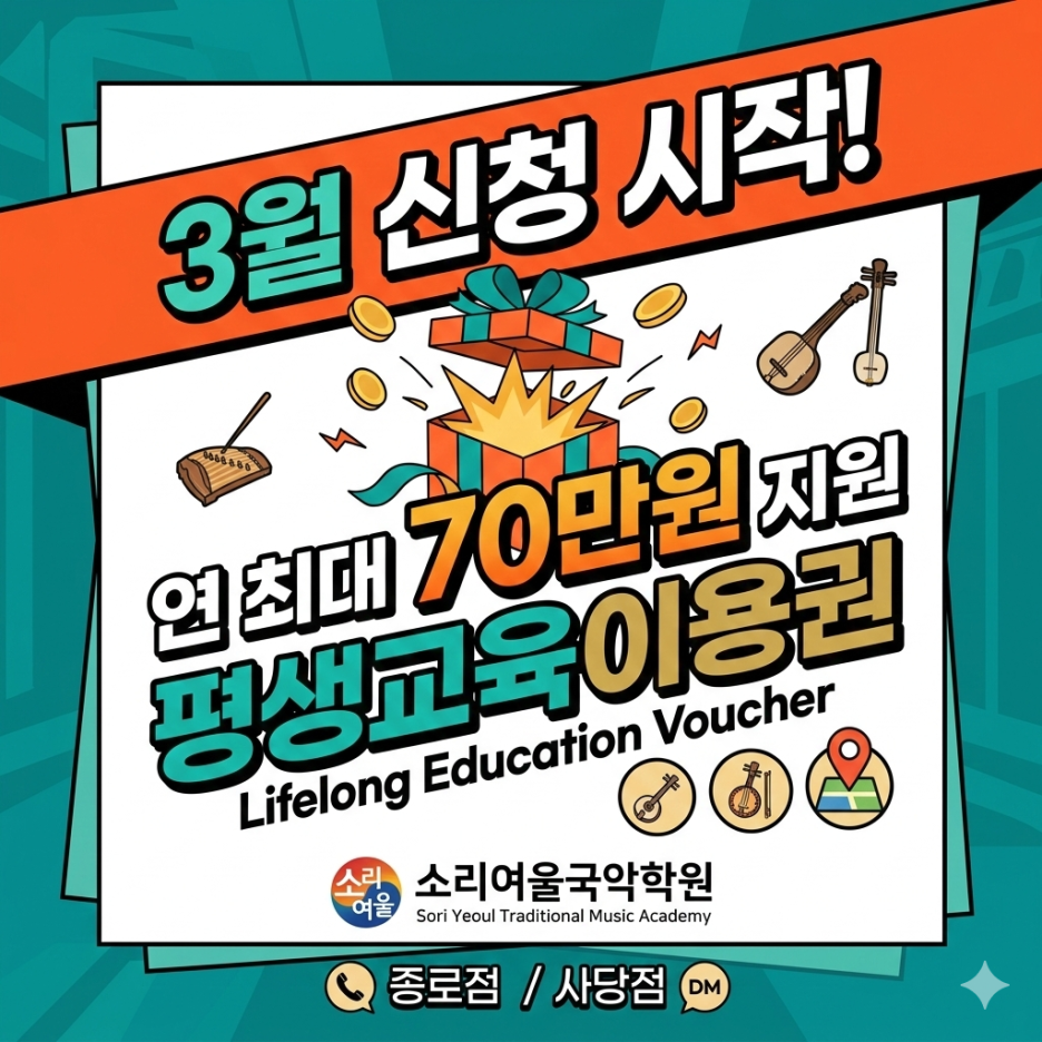 #평생교육이용권 #평생교육바우처 #2026평생교육바우처 #교육비지원 #국가바우처 #배움지원금 #자기계발 #성인취미 #직장인취미 #국악배우기 #해금배우기 #가야금배우기 #거문고배우기 #대금배우기 #국악학원 #소리여울국악학원 #소리여울 #종로취미 #사당취미 #문화생활 #취미생활추천 #경기도평생교육이용권