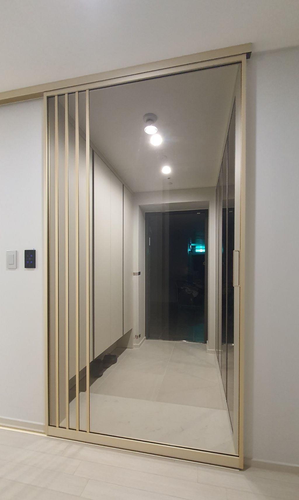 이러한 조합으로 완성된 원슬라이딩중문은 포항 푸르지오 마린시티 아파트 현관에 깔끔하고 모던한 분위기를 더해주었습니다.