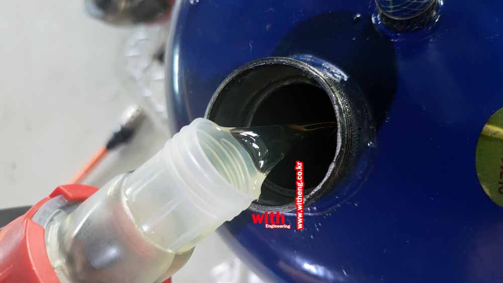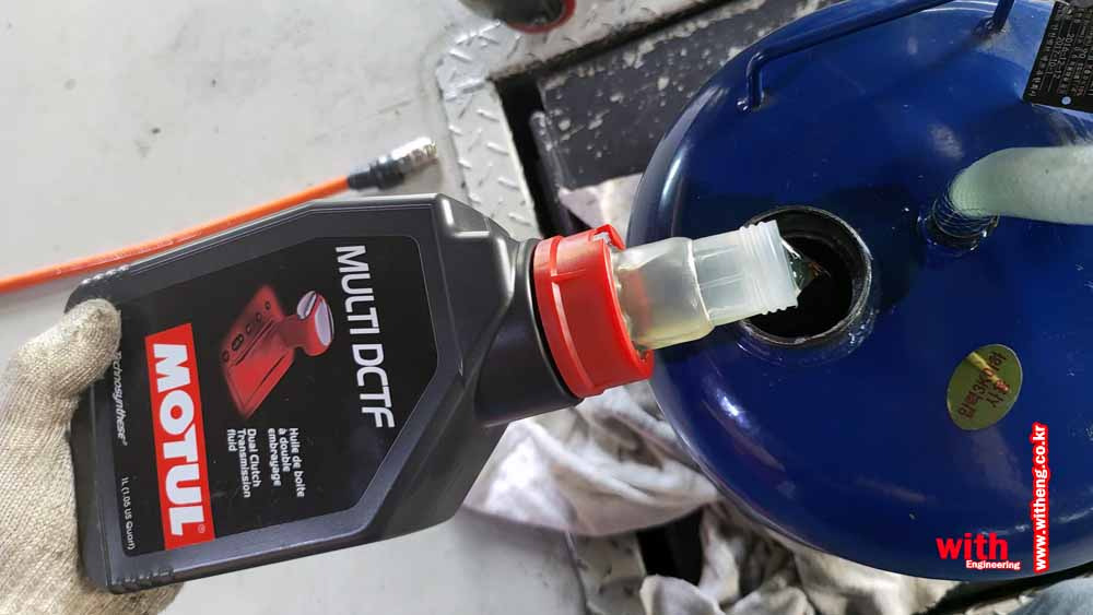 미션오일 주입기에 모듈 DCTF 미션오일 주입하는 중입니다. 색깔 비교해 보셔요.