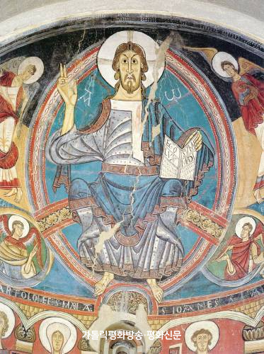 - 요한 묵시록은 많은 상징을 담은 환시를 통해 예수 그리스도의 계시를 전달하는 책으로 교회의 권위 있는 주석과 주해를 바탕으로 대해야만 바르게 읽고 올바로 이해할 수 있다. 그림은 1125년에 제작한 스페인 타울 성 클레멘스 성당의 프레스코화로, 요한 묵시록에 등장하는 종말에 오실 그리스도 왕을 묘사하고 있다.