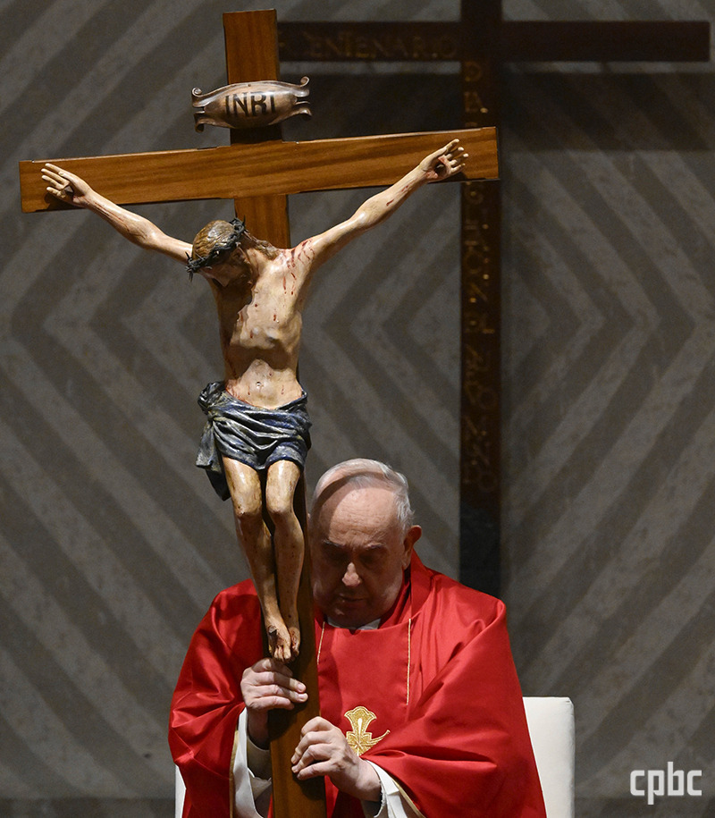 - 예수님 십자가 위로 ‘유다인들의 임금 나자렛 사람 예수’라는 뜻의 ‘I.N.R.I’가 보인다. 프란치스코 교황이 십자가를 들고 예식을 거행하고 있다. OSV