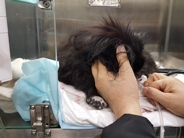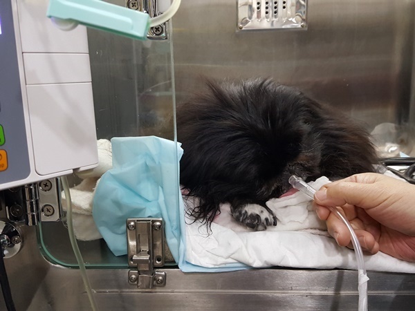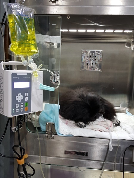 오후4시에 수술 시작되어 5시 넘어 산소케이지에 들어간 깜돌이는