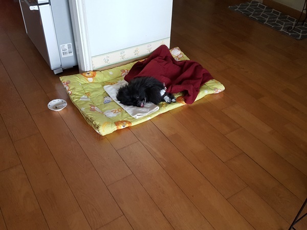 집에 들어와서도 이렇게 찬 바닥에만 엎드려 있더군요 (통증이 있으니 움직임도 없고)