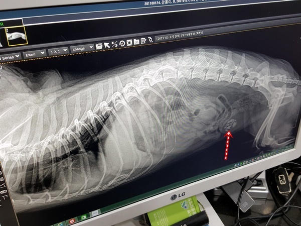 수술전 엑스레이상에..결석이 아래쪽에 뭉쳐있더군요