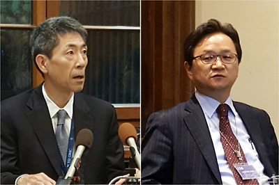 | Chung Hae-kwan (right), director general in charge of legal affairs at the Trade Ministry and Junichiro Kuroda, who represents the Japanese Trade Ministry (Yonhap) |