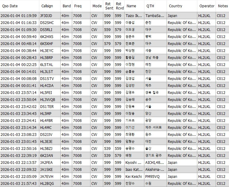 [제471회/260104] 일요 우리글 교신 결과 (HL2LKL, C012) 작성자DSØAHQ|작성시간26.01.04|조회수14 목록 댓글 2 글자크기 작게가 글자크기 크게가 KDNC012DS0AHQ_20260104_HL2LKL.adi53.60KBTime : UTC (KST-9) 첨부파일첨부된 파일이 2개 있습니다. jpg 파일 DS0AHQ_20260104_HL2LKL.jpg 다운로드 etc 파일 DS0AHQ_20260104_HL2LKL.adi 다운로드 다음검색 현재 게시글 추가 기능 열기 북마크 신고 센터로 신고 댓글 댓글 2 댓글쓰기 답글쓰기 댓글 리스트 작성자6K2EGQ | 작성시간 26.01.04 새해 첫 한글스케줄교신 수고 많으셨습니다 작성자DS3EXT | 작성시간 26.01.15 수고하셨습니다 댓글 전체보기