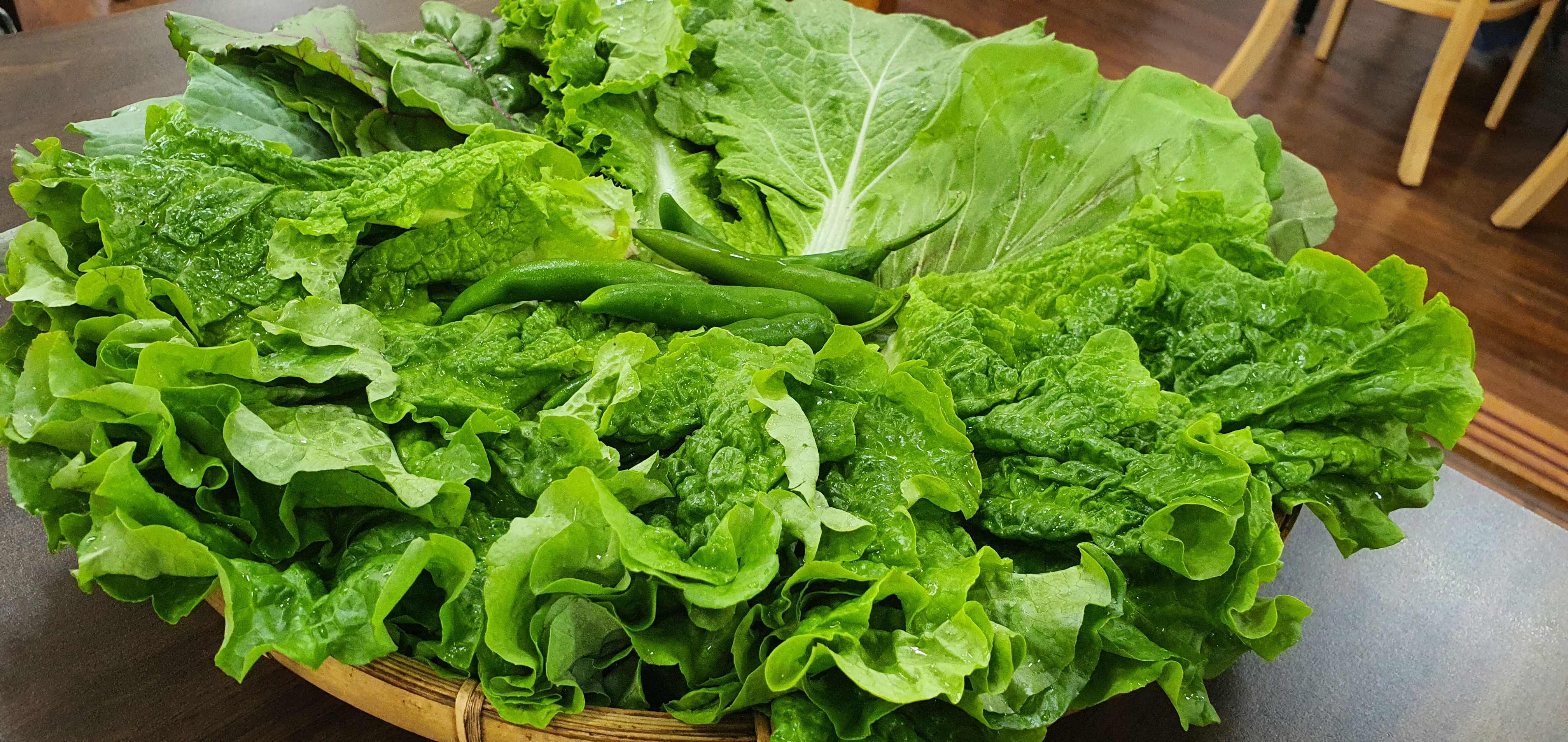 쌈채소가 여러가지가 있는 건강식 식사입니다.