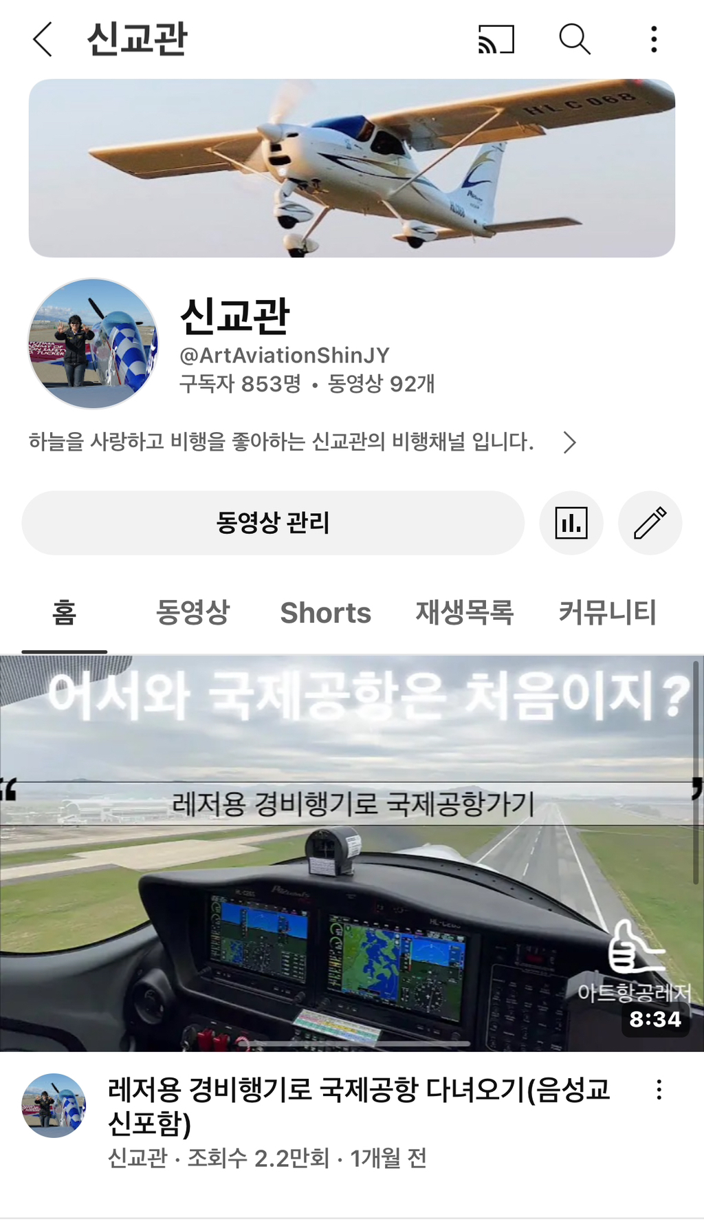 신교관 유투브 채널로 놀러오세요~~ 작성자신교관|작성시간24.07.22|조회수226 목록 댓글 1 글자크기 작게가 글자크기 크게가 https://youtube.com/@artaviationshinjy?si=HVKjNSJGrT6xY8nq신교관하늘을 사랑하고 비행을 좋아하는 신교관의 비행채널 입니다. 아트항공레저 안성비행장 경기도 안성시 공도읍 신두만곡로 250-91 나주비행장 전남 나주시 남평읍 우산리 2413 문의전화 031-881-4009www.youtube.com 다음검색 현재 게시글 추가 기능 열기 북마크 공유하기 신고 센터로 신고 댓글 댓글 1 댓글쓰기 답글쓰기 댓글 리스트 작성자petitepilotbon | 작성시간 24.10.09 오~! 오랜만에 들어왔는데.. 유튭 채널을 개설하셨군요. 구독과 알림설정하고 갑니다!^^👍🙏🧡😊 댓글 전체보기