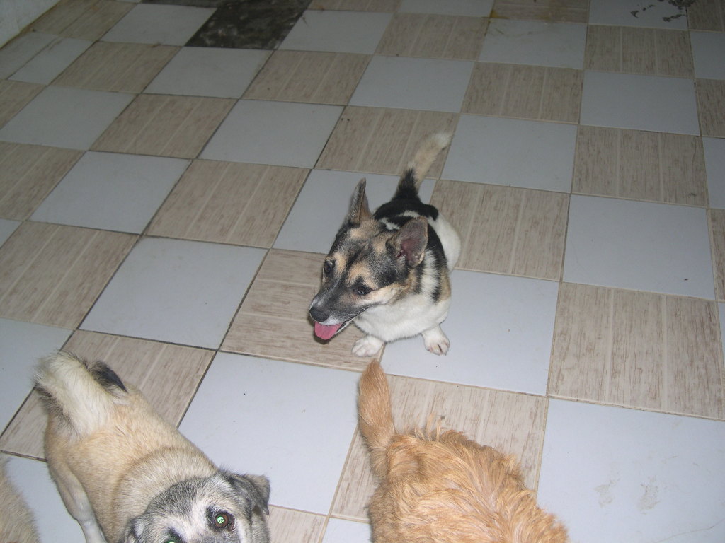 오른쪽 가에 있는애가 엄마이고 중간에 사납게 짖고 있는애는 남매지간으로 애들외삼촌인 셈입니다.