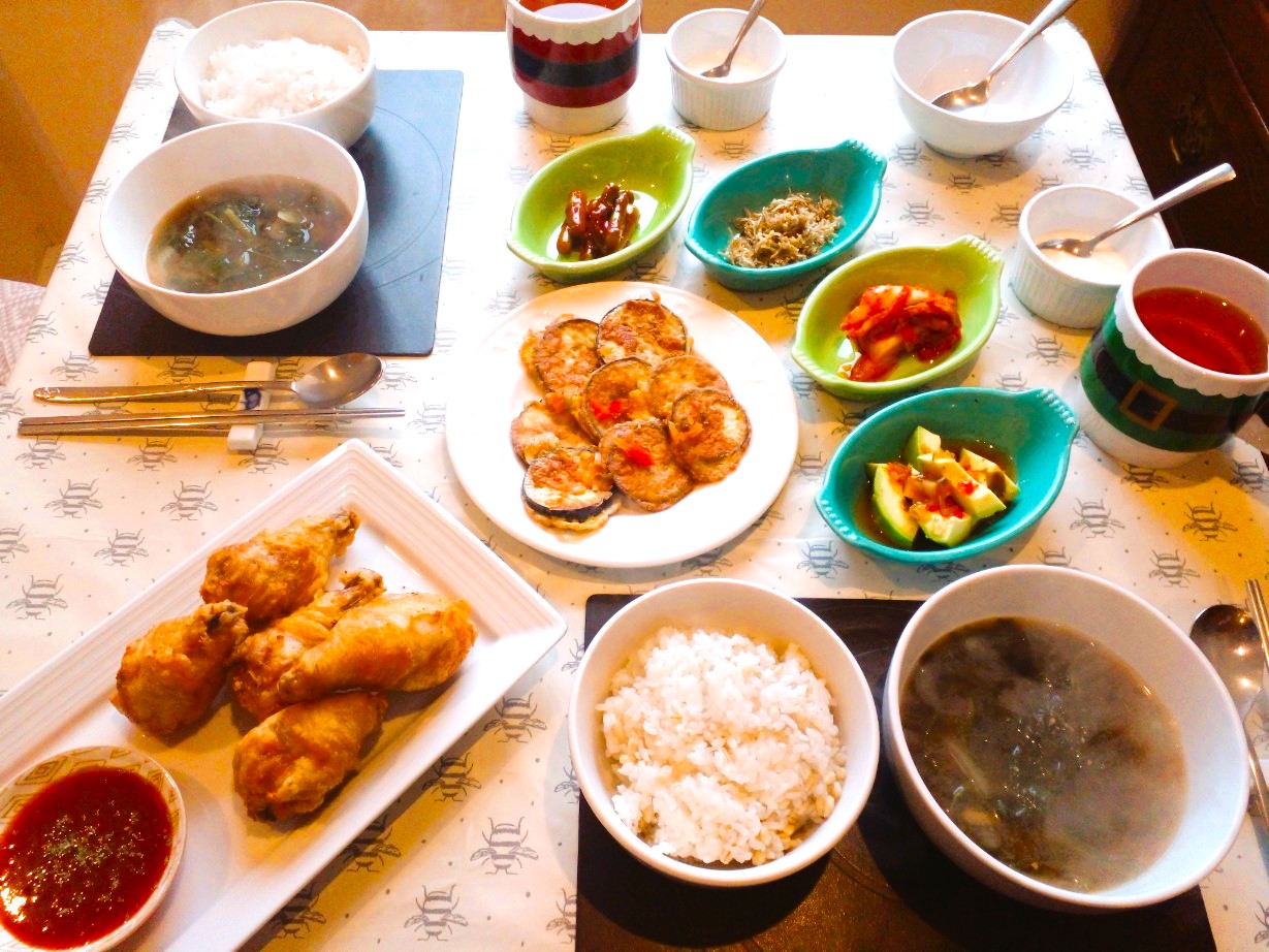 시래기된장국, 닭다리튀김, 가지전, 아스파라거스무침,
