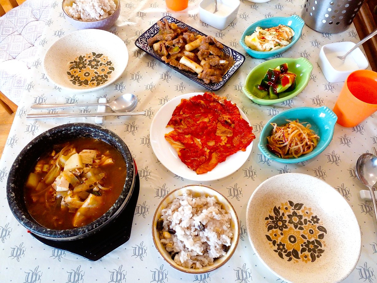 해물된장국, 돼지떡불고기, 김치부침개, 계란찜, 오이초무침,