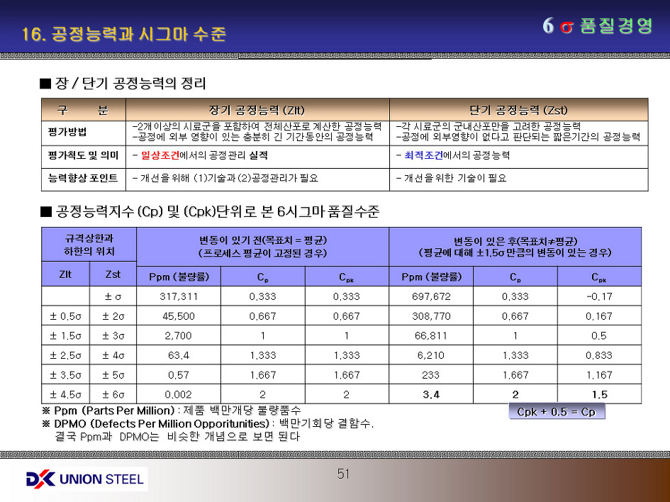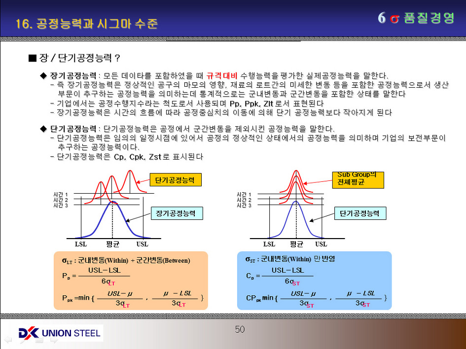 이 공정능력은 다시 장기 (Zlt) 와 단기 (Zst) 로 나누어 지게 되는데, 장기 공정능력이란 군내 그리고 군간변동을 포함한 ... 장기간 (공정에 외부의 영향을 미칠 수 있는 충분한 기간) 에 걸쳐 모든 데이터를 포함한 개념이다. 반면 단기 공정능력은 일정시점에 있어서의 공정의 정상적인 상태에서의 공정능력을 의미하며 군간변동을 제외한 개념이다.