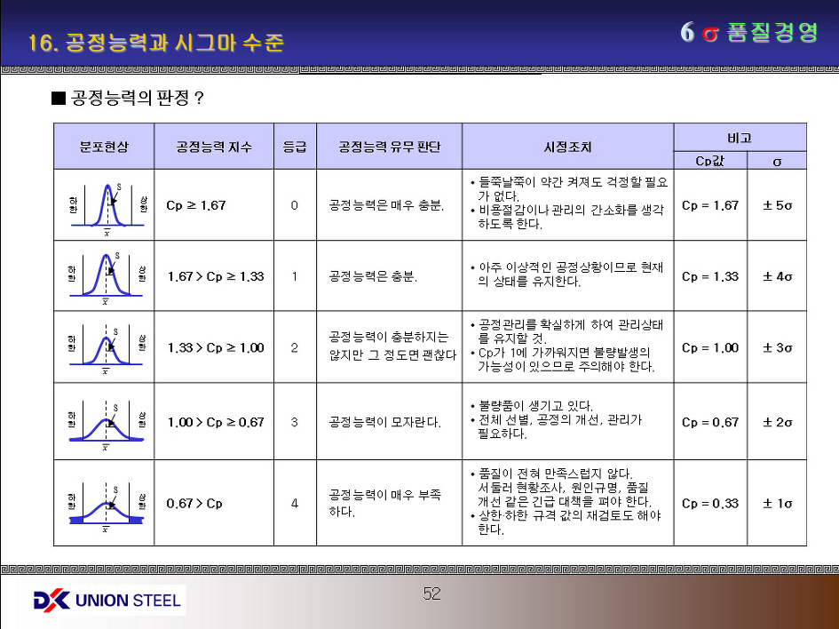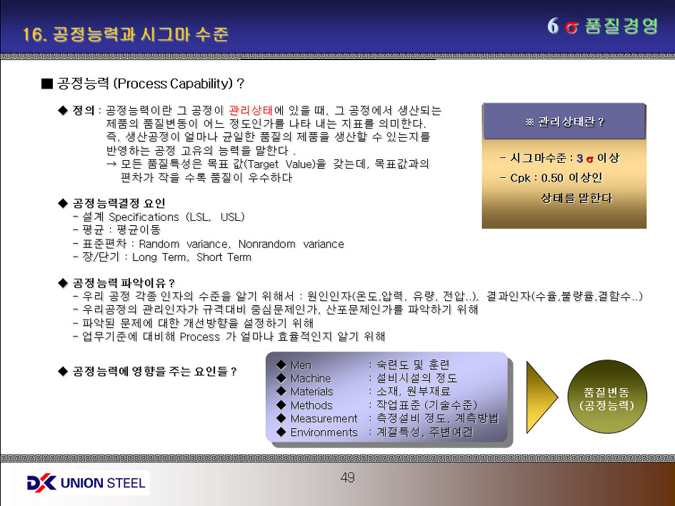 공정능력이란 흔히들 3시그마 수준하에서 양품을 생산할 수 있는 능력을 말한다고 이해하고 있는데 이는 단순히 (생산) 관리측면에서 공정을 이해하는 것이다. 그러나 공정능력의 정확한 개념은 그 공정이 "관리상태하" 에 있을 때 그 공정에서 생산되는 제품의 품질변동이 어느 정도인가를 나타내는 지표를 말한다.