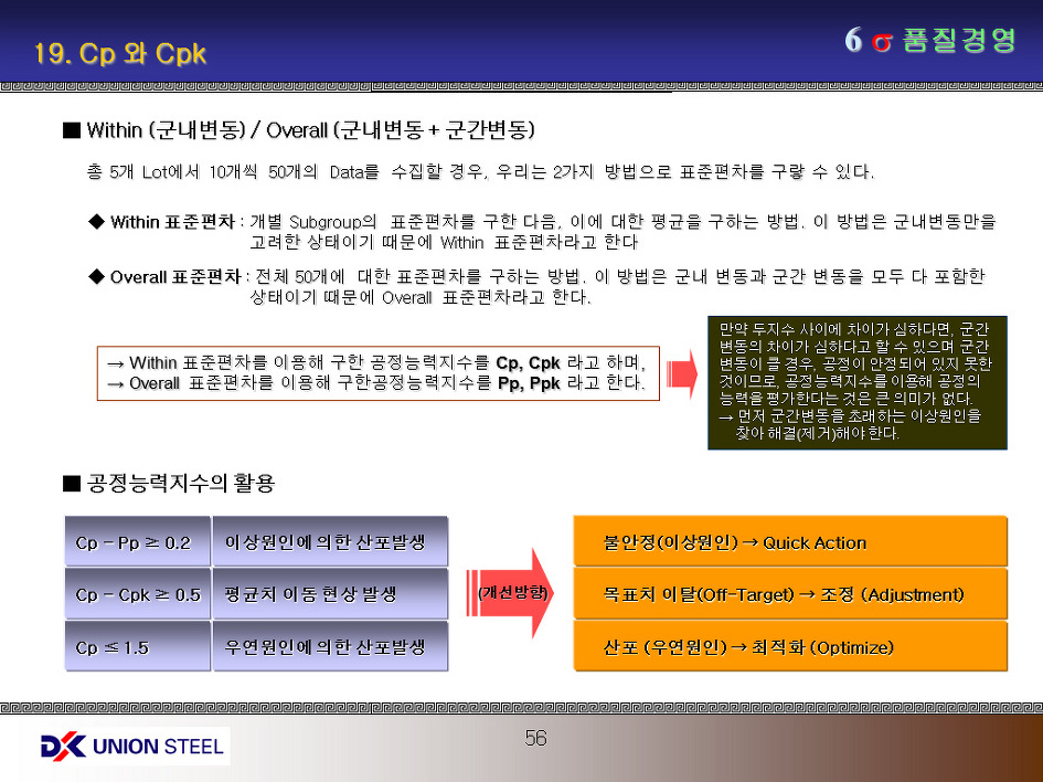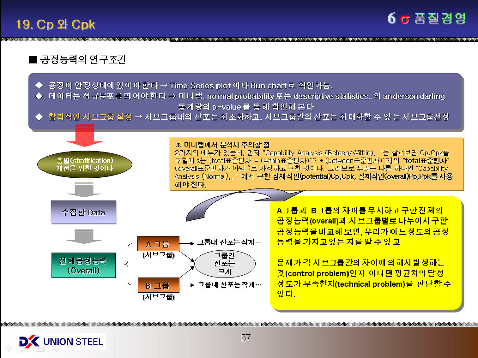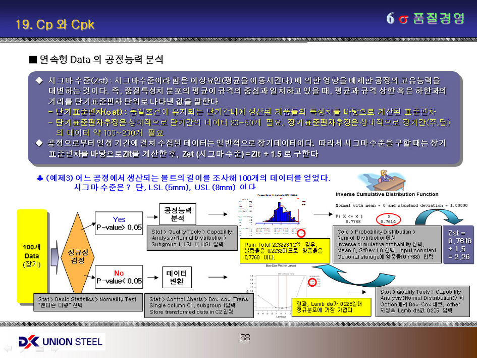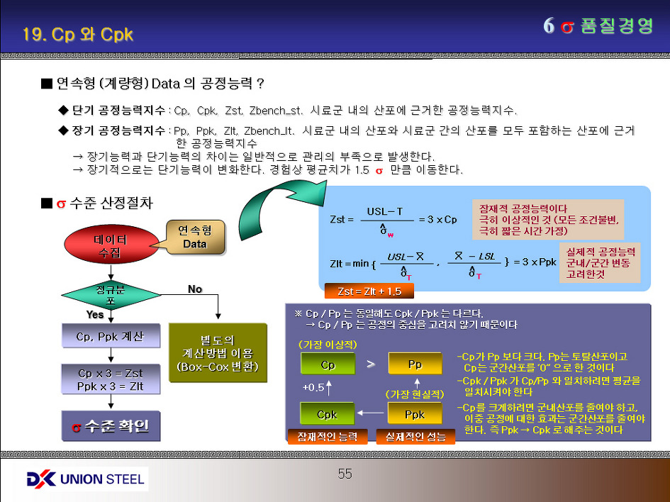 공정능력은 단기 (Zst) 와 장기 (Zlt)가 있다고 했다. 이들의 차이는 간단히 설명한다면 단기는 잠재적 공정능력을 의미하고 장기가 군내, 군간을 포함하는 현실적인 공정능력이다. 그리고 장기적으로는 단기공정능력이 변하게 되는데 그 범위가 경험칙상 1.5시그마 만큼 이동한다고 한다. 따라서 우리가 공정능력을 알아보기 위해 Data를 수집할때에는 극히 짧은 시간에 수집하는 것이 아니기 때문에 장기 Data로 보아야 하므로 공정능력 즉 그 공정의 시그마 수준을 구하고자 할 때에는 장기 표준편차를 바탕으로 Zlt를 계산한 후 1.5시그마를 더해주면 Zst가 되는 것이다. .. 즉 Zst = Zlt + 1.5 이다
