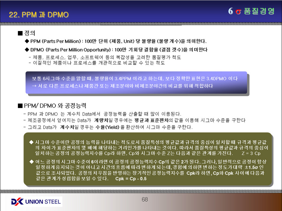 이 PPM과 DPMO의 개념은 계수지 Data (이산형 Data) 의 공정능력을 산출할 때에 사용하는 개념이다. 반대로 계량치 Data의 경우에는 평균과 표준편차를 이용한다.