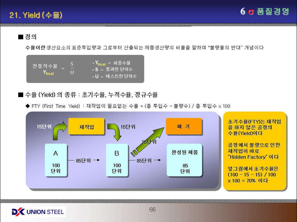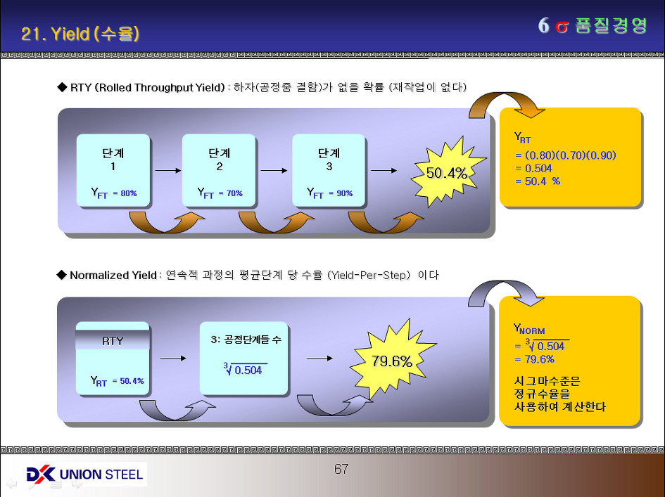 수율이란 Input vs Output 간의 비율을 의미한다. 즉 생산과정에서 발생된 불량품을 제외한 양품율을 의미하는 것이다. 이 수율의 개념에는 3가지가 있다. 즉 초기수율 (FTY), 누적수율 (RTY), 정규수율 (Normalized Yield)가 그것인데 시그마수준은 정규수율을 사용한다.