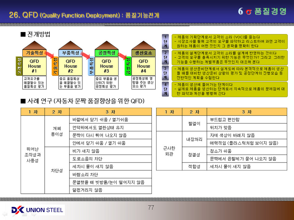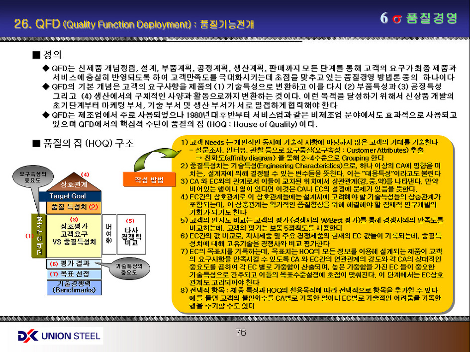 QFD란 "품질기능전개" 라는 의미인데 이는 신제품을 개발하거나 아니면 고객이 요구하는 품질수준을 확보하기 위하여 설계에서부터 최종 서비스까지를 모두 반영하는 품질경영 방법론 중의 하나이다.