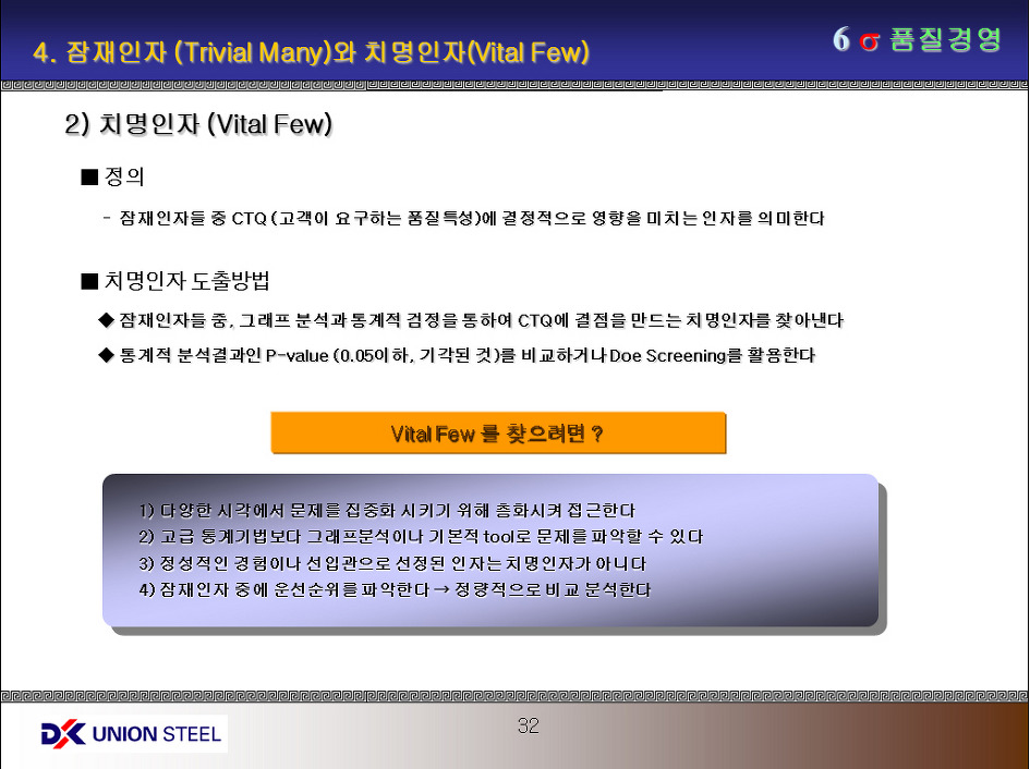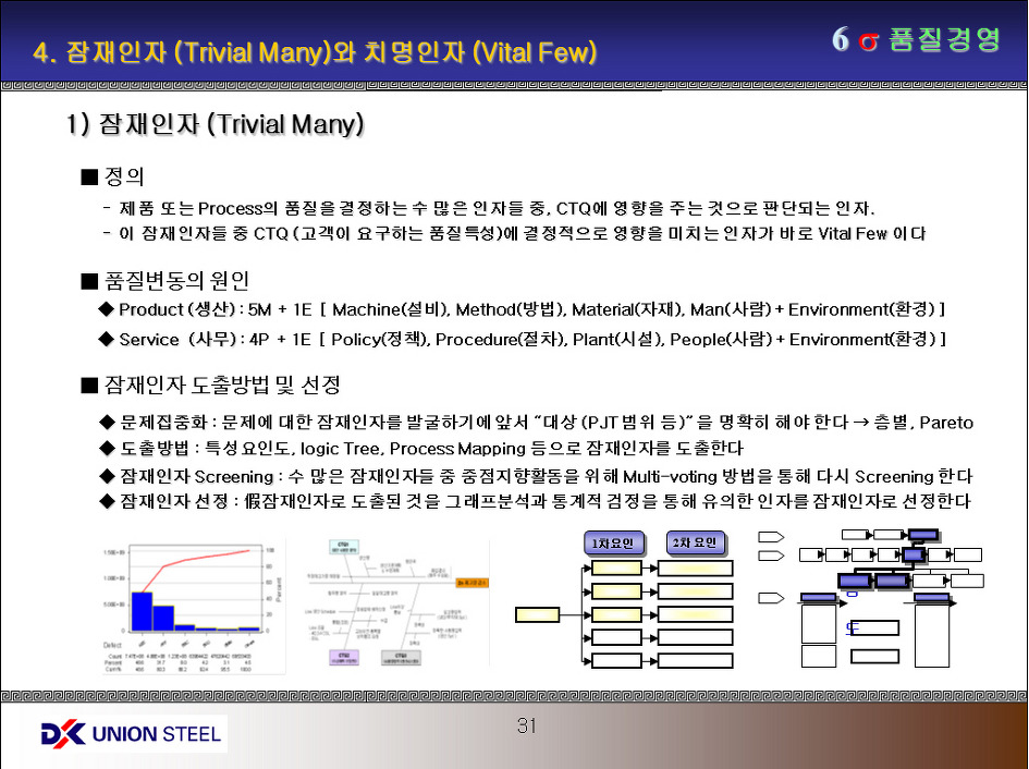 말이 다른 곳으로 흘렀지만, 고객의 Needs에 따라 제품을... 그것도 고객의 스펙에 맞는 (요구하는 품질 수준... 그 이하이거나 그 이상이라도 불량이다) 제품을 생산해 나가는 과정에서 보면 제품의 품질에 영향을 주는 변수는 무척 많이 있게 된다... 즉 품질에 영향을 주는 변동요인이라는 것인데... 그것들을 크게 분류해 보면 잠재인자 (이것은 하찮지만 너무나 많이 잠재해 있는 요인들이다... Trivial Many)... 반면, 그 하찮은 요인들 중에서 정말로 제품의 품질에 결정적으로 영향을 미치는 중요한 요인들이 몇몇이 있게 되는데 그것들을 치명인자 (Vital Few) 라고 한다. 6시그마에서는 이처럼 고객이 원하는 품질의 제품을 생산해 내기 위하여 그러한 치명인자들을 정확히 추려내어 해결함으로써 고객이 원하는 품질의 제품을 적기에 생산, 납품하려는 데 있다.