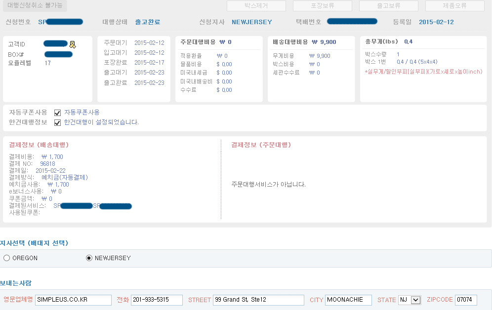 ● 배대지 이용 구매내역 (심플유에스 공홈 > 대행현황 > 신청번호 > 캡쳐)