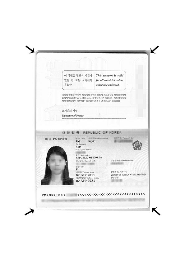 여권복사본 상의 네 귀퉁이와 사진, 바코드 및 개인 인적사항이 정확하고 깨끗하게 보여야 한다.'
