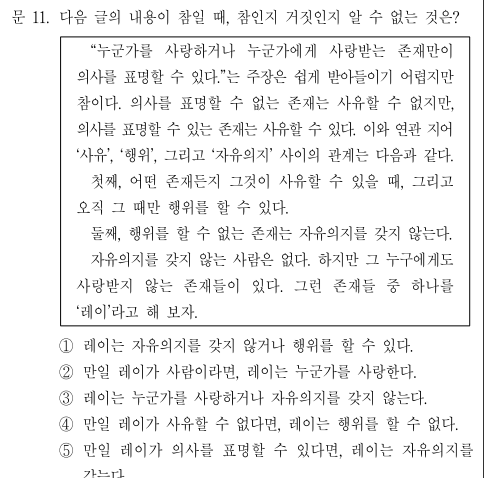 작성자반달가면곰-_- 작성시간 15.01.28 문11 "만이" 이게 포인트에요~ 첫문장을 익숙한 문장으로 바꾸면 "의사를 표명할 수 있다면, 누군가를 사랑하거나 누군가에게 사랑받는 존재다." 에요~