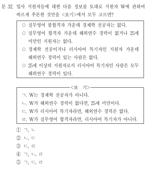 W가 합격자일 때, 2번째 보기를 보고 해외연수 경력이 있고 25세 이상이여야 한다고 생각 했습니다.. 그리고 지문 ㄷ을 판별 할려고 했을 때 러시아어 특기자라면 해외 연수 경력은 없다는 것을 2,3번 보기에 적용시켜 생각했을 때 러시아어 특기자는 해외연수 경력은 있다는 것 같았는데... 이런식으로는 답을 구해 낼 수 가 없었습니다.