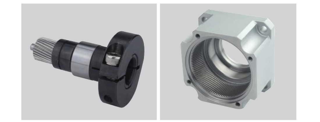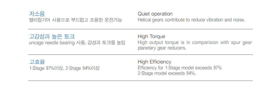 | 감속기의 입력축과 모터 출력축을 연결하기 위한 Collet Clamp 방식으로 역학상 확실한 체결력과 동심도를 보장하여 높은 속도에서 구동할 때에도 백래쉬가 발생하지 않고 동력을 전달합니다. | 감속기 케이스에 내치기어를 일체형으로 정밀 가공하였고, 헬리컬기어로 되어 있으며 기어의 교합율은 일반 스퍼기어의 2배 이상이며 원활한 운전과 낱은 소음으로 높은 회전출력과 낱은 백래쉬를 특징으로 합니다. |