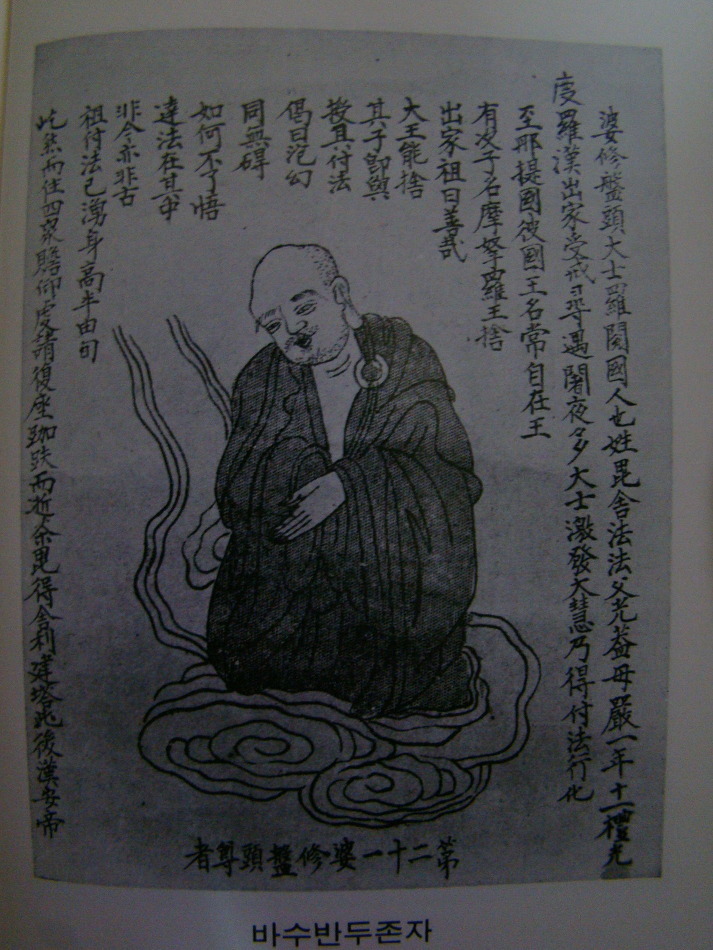 직지심경 36 / 바수반두 존자 / 물거품이 곧 실상이다 직지심경(直指心經)해설 36 서천의 조사(西天祖師) 제21조 바수반두 존자(波須般頭尊者) <물거품이 곧 실상이다> 第二十一祖 波須般頭尊者가 偈曰 泡幻同無碍어늘 如何不了悟오 達法在其中이면 非今亦非古니라 제21조 바수반두 존자가 게송으로 말하였다. 물거품과 환술이 다 같이 걸림이 없는데 어찌하여 그것을 깨닫지 못하는가? 이치가 그 가운데 있는 것을 통달한다면 지금도 아니요 또한 옛도 아니로다. 해설 ; <경덕전등록>에 의하면 바수반두 존자는 나열성(城) 사람이다. 성은 비사거(毘舍佉)며, 아버지는 광개(光蓋)며 어머니는 엄일(嚴一)이었다. 집은 부유하나 아들이 없었으므로 부처님 탑에 기도하여 자손을 구하였다. 하루 저녁에는 그의 어머니 꿈에 밝은 구슬과 어두운 구슬 두 개를 삼켰다. 꿈을 깨고 태기가 있었는데 7일이 지나서 현중(賢衆)이라는 아라한이 그의 집에 왔다. 아버지인 광개가 예를 올리니 현중 아라한이 단정히 앉아서 받았다. 어머니인 엄일이 나와서 절을 하니 현중 아라한이 자리를 피하면서 말하기를, “도리어 법신대사에게 예를 올립니다.”라고 하였다. 광개가 그 까닭을 알 수 없어서 시험 삼아 보배 구슬을 드리니 현중 아라한이 곧 받고는 아무런 겸손함도 없었다. 광개가 참을 수 없어서 물었다. “나는 남자인데 절을 하여도 돌아보지도 않더니 나의 아내는 무슨 공덕이 있어서 존자께서 예를 피하십니까?” “내가 그대의 절을 받고 보배 구슬을 받는 것은 그대를 복되게 하기 위함이다. 그대의 아내는 거룩한 분을 잉태하였는데 출생하면 반드시 세상의 지혜의 등불이 될 것이므로 내가 예를 피한 것입니다.”라고 하였다.