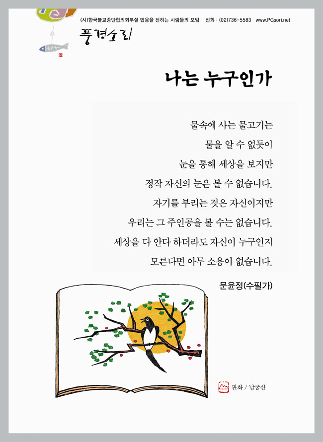 [스크랩] 풍경소리 - 나는 누구인가 작성자자금대|작성시간13.03.11|조회수8 목록 댓글 1 글자크기 작게가 글자크기 크게가 출처 : 풍경소리 http://www.pgsori.com/ 다음검색 스크랩 원문 : 가장 행복한 공부 현재 게시글 추가 기능 열기 북마크 공유하기 신고 센터로 신고 댓글 댓글 1 댓글쓰기 답글쓰기 댓글 리스트 작성자자금대 작성자 본인 여부 작성자 | 작성시간 13.03.11 선가에서는 '눈은 눈을 볼 수가 없다'라고 합니다 댓글 전체보기