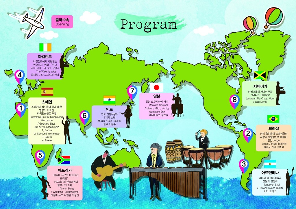 이번 공연은 세계음악을 여행하는 컨셉의 고품격 음악공연으로 아시아에서 아프리카 남미유럽까지 까지 각 지역의 음악을 타악기로 연주한다.