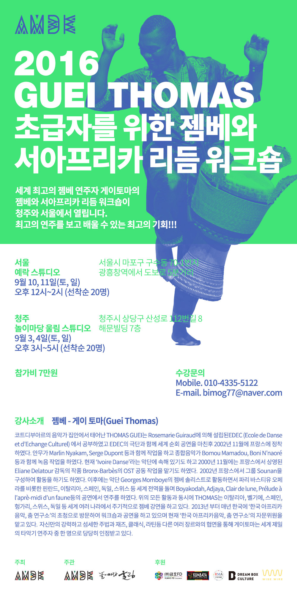 청주의 '놀이마당 울림'과 AMD Korea가 함께 주관하는 세계 최고의 젬베연주자 워크숍에 많은 참가 바랍니다.