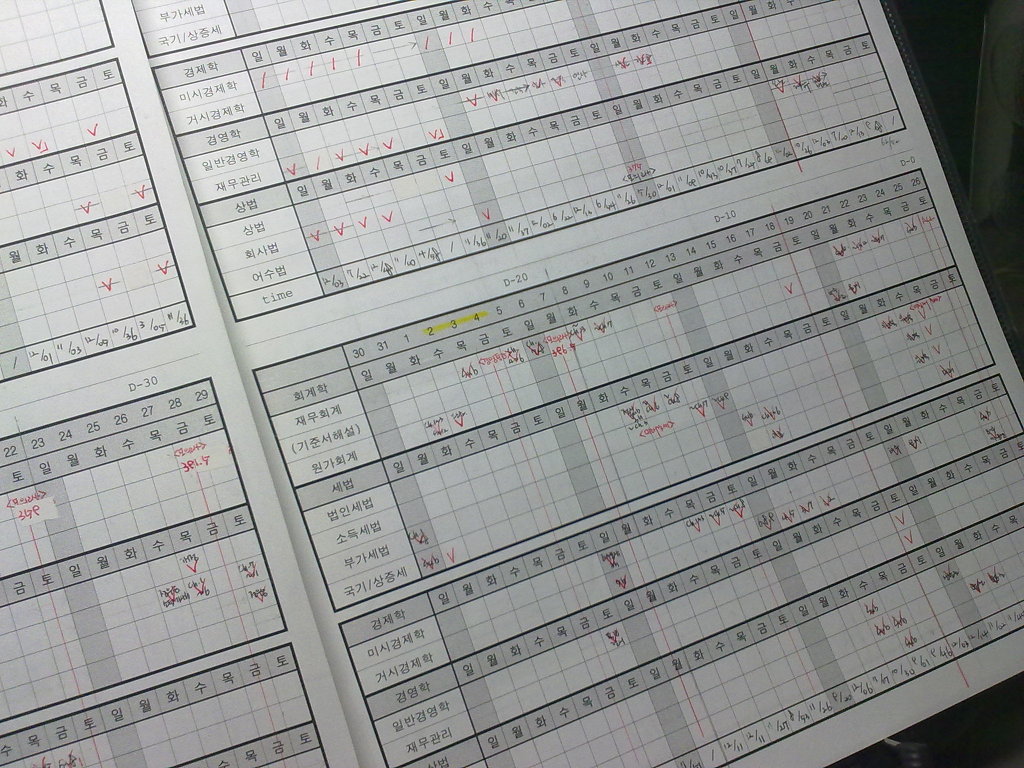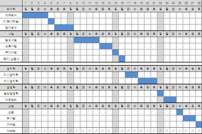 1차때그냥 쉬는날에 한번 만들어본 엑셀표였는데, 전에 부터 엑셀로 만들었던 1차계획표 양식 파일 달라고 쪽지를 너무 많이 받아 메일로 보내 드리다가그냥 업로드 해드립니다. 엑셀파일이고 날짜만 고쳐가면서 쓰심 됩니다. 과외할때 과외생들 공부하는 진도 감시할때 매우 유용하게 사용했었죠ㅋㅋ 쓰는 방법은.. 그냥 샤프로 어떻게 공부할지 계획을 잡아보고 실제 날짜 지나가고나면 볼펜으로 실제로 공부한 챕터정도 매일 기록해나가면 됩니다. 그럼 자기가 그 챕터 공부하는데 기간이 얼마나 걸렸는지, 자기가 그부분 본지 얼마나 지났는지, 그리고 한달동안 공부해도 얼마나 할게 많은지.. 한눈에 알 수 있는게 장점입니다. 밑에 Time부분에는 공부한 시간을 기입하면 됩니다. < 1월 1회독 계획 예시 > 1월달에 만약 하루에 한과목씩 할 경우 한달간 1회독 돌리는데 할당할 수 있는 시간 계획표에 보여 드립니다. 과외하시는분들 공부안할때 1,2월에 공부해야할 량 보여준다면서 맨날 같이 그려보던 1회독 스케쥴ㅋㅋ 1월에 이페이스로 진도 빠지면 1차합격은 수월히 가능 :) 이거 정부회계도 안넣고 쉬는날 하나도 없이 짰는데 정말 우리 1차량 너무 많죠 ㅜ 근데 이 페이스대로 해도 1회독 끝나면 재무회계는 안본지 한달이 되어버린다는 것 -_- |