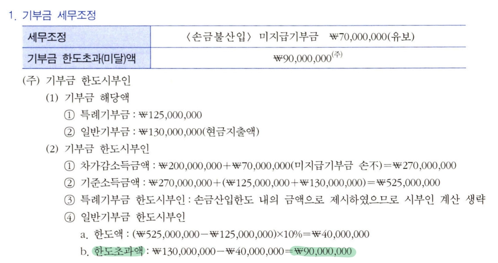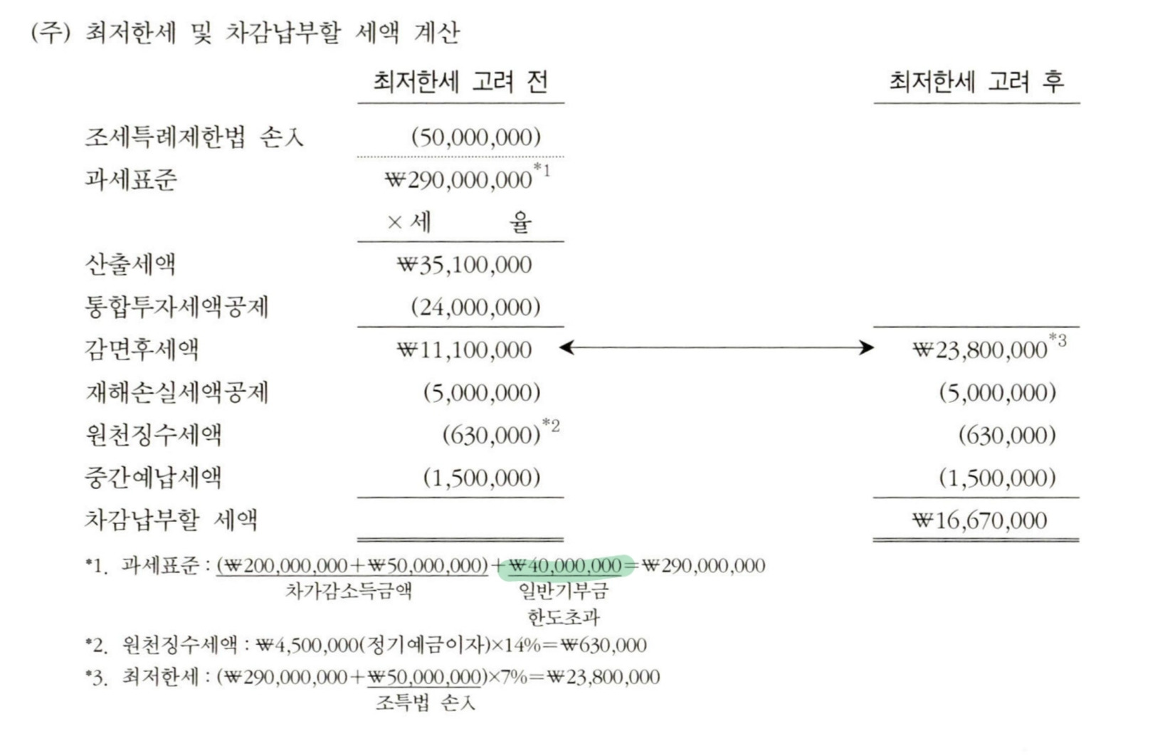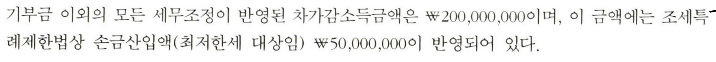 간단한 세법 질문이요! 작성자끄으으읕|작성시간25.06.01|조회수143 목록 댓글 1 글자크기 작게가 글자크기 크게가 과표가 왜 290인지 모르겠어요.차가감 200 +70 +90 = 360 아닌가요? 다음검색 현재 게시글 추가 기능 열기 북마크 공유하기 신고 센터로 신고 댓글 댓글 1 댓글쓰기 답글쓰기 댓글 리스트 작성자!!!!@ | 작성시간 25.06.29 차가감은 이미 익금산입, 손금산입같은 세무조정이 이미 완료된 금액을 말해요. NI+익금산입-손금산입=차가감+기부금한도초과-기부금한도초과이월액=각사소-이비소=과표!! 댓글 전체보기