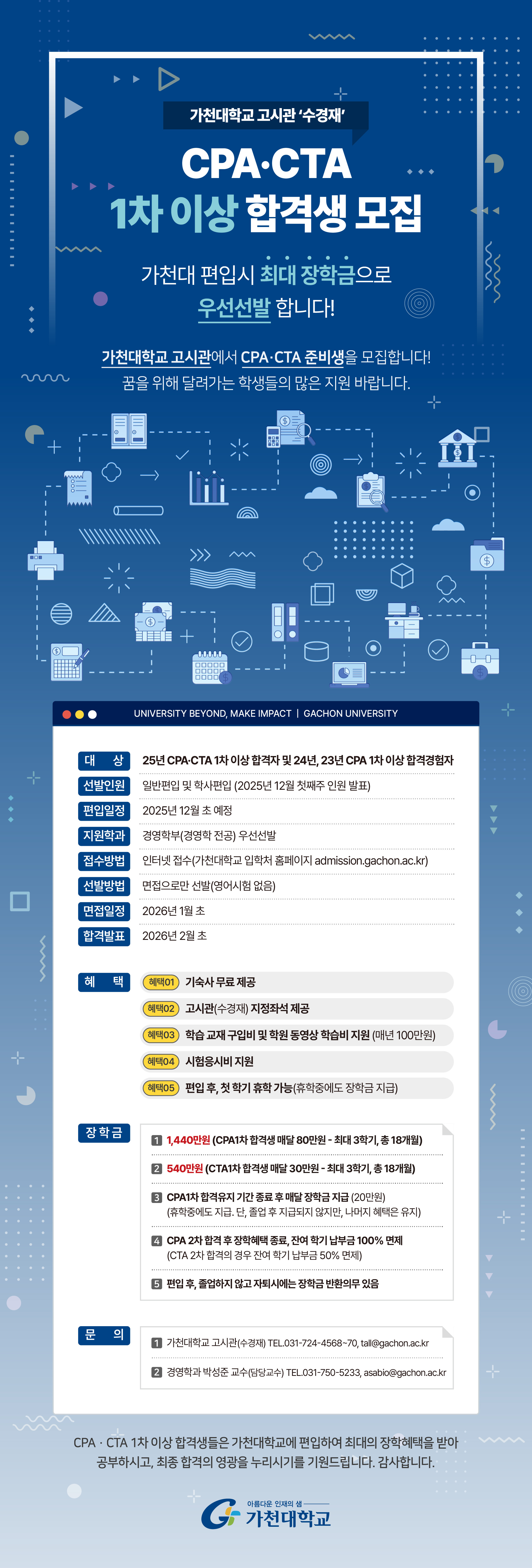 지난 10년간 가장 많이 성장한 가천대학교에 편입하시어, 최대 장학금을 받고 회계사, 세무사 시험에 합격하시기 바랍니다. 감사합니다.