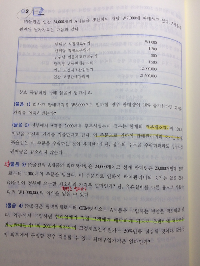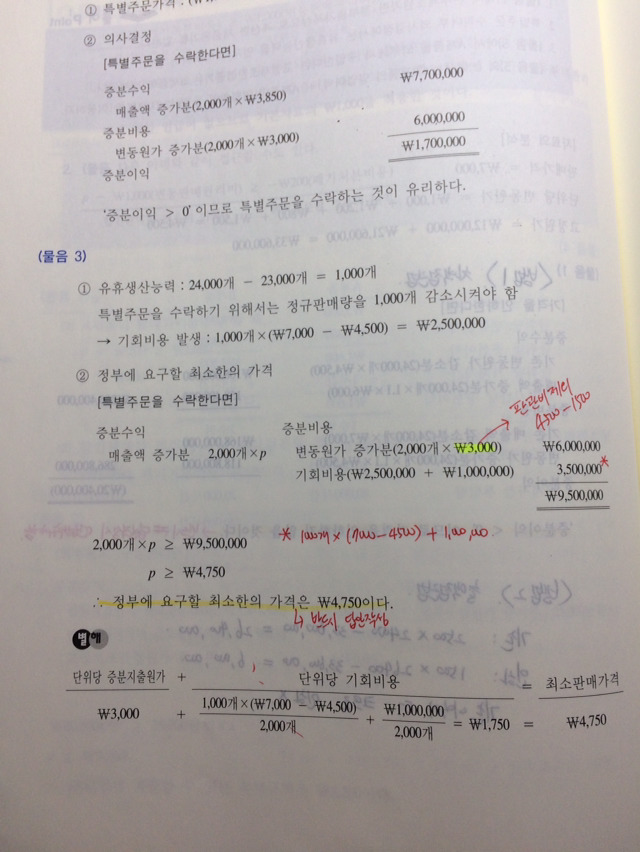 작성자cupcake 작성시간 17.03.09 2000개 주문 받으면요, 유휴생산에서 1000개 생산할 수 있겠죠? 그러면 유휴생산에서 얻을 수 있는 100만원 포기해야되고요. 나머지 1000개는 기존의 판매 1000개를 줄여서 생산해야 하거든요. 그래서 포기해야 되는 것이 기존 판매 1000개의 공헌이익이랑 유휴생산 100만원 두가지입니다.