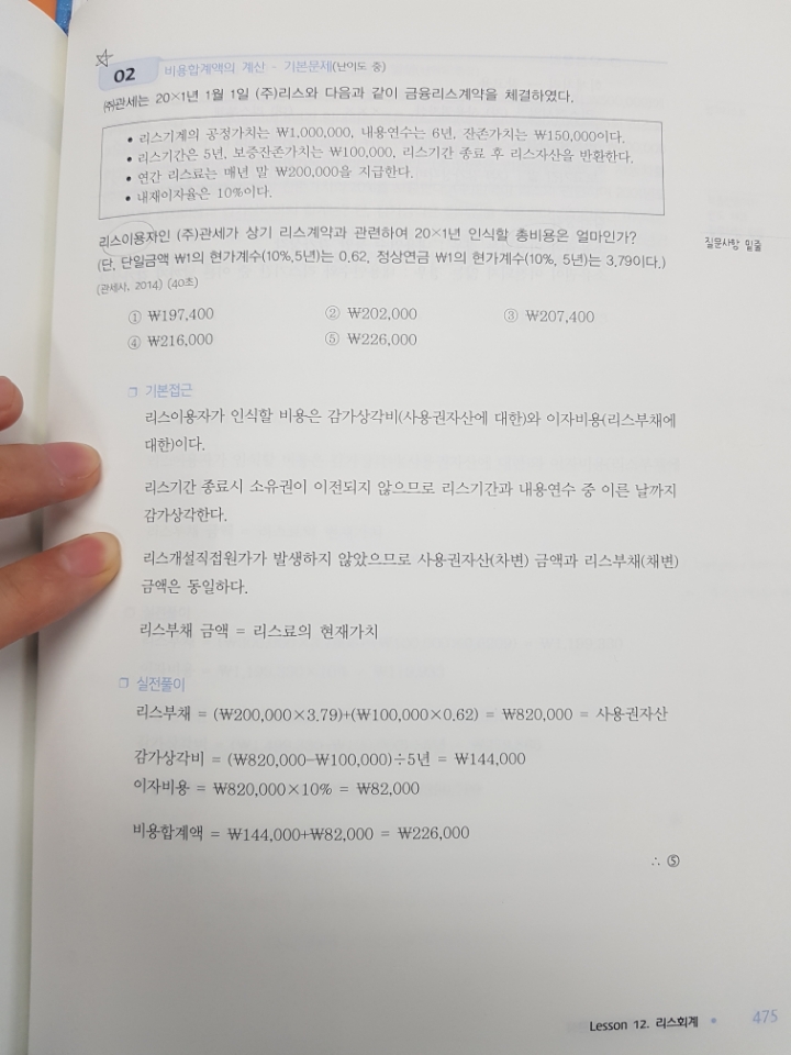 ㅎㅎ 간단명료하게 답변드리겠습니다. 시험문제는 회계학원의 회계사가 출제하는게 아닙니다. (위 교재가 어느 분 교재인지 궁금합니다) 대학 회계학 교수님이 출제하는데요, 교수님 저서는 모두 다 보증잔존가치를 차감하여 감가상각비를 계산하였습니다^^ 즉, 위 교재 무시하시고 제 교재내용대로 공부해 주세요^^ 기본서를 회계학원용 교재로 하면 절대적으로 비효율적입니다.
