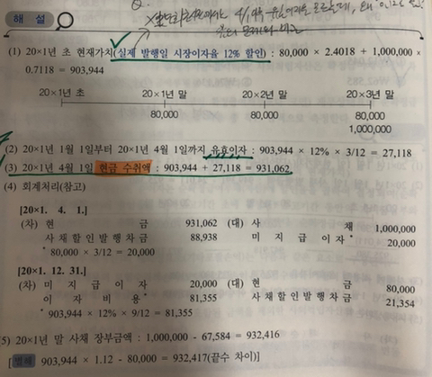~> 기초 기준 PV(유효이자율은 실제발행일 기준이자인 0.12) + 3개월분 상각액