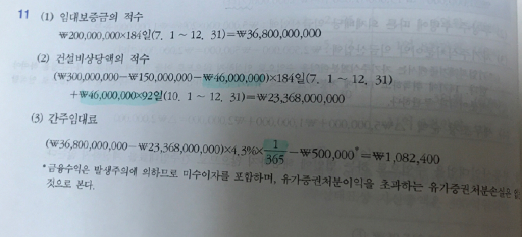 작성자ID 회린이 작성시간 20.07.05 토지가액 150,000,000제외하면 건설비가 150,000,000 남아있죠? 근데 그중에서 자본적 지출(46,000,000) 의 경우 임대개시일 전에 지출한거면 그냥 보증금적수및 건설비 적수랑 똑같이 184일 하시면 되는데 임대개시일 후에 지출한거라서 10/1~12/31 부분 즉, 92일분을 곱해줘야 합니다. 따라서 150,000,000-46,000,00 -> 건설비 적수에서 자본적 지출 제외분은 184일을 곱하고, 46,000,000은 92일을 곱해야해요