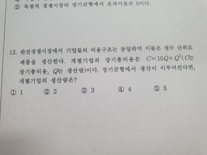 15년도 경제학 완전경쟁시장 문제 작성자리치E|작성시간22.01.22|조회수179 목록 댓글 1 글자크기 작게가 글자크기 크게가 이 문제 어떻게 풀어야 할까요...?ㅠㅠ계속 0이 나오네요ㅠ정답은 1입니다..! 다음검색 현재 게시글 추가 기능 열기 북마크 공유하기 신고 센터로 신고 댓글 댓글 1 댓글쓰기 답글쓰기 댓글 리스트 작성자innovative | 작성시간 22.01.22 문제 조건이 생산이 이루어진다는거라서최소점이 q=0 q=-10이긴해도 q=0이 될수없어그래서 정수중에 가장 작은 q=1이 답이되는거같다 댓글 전체보기