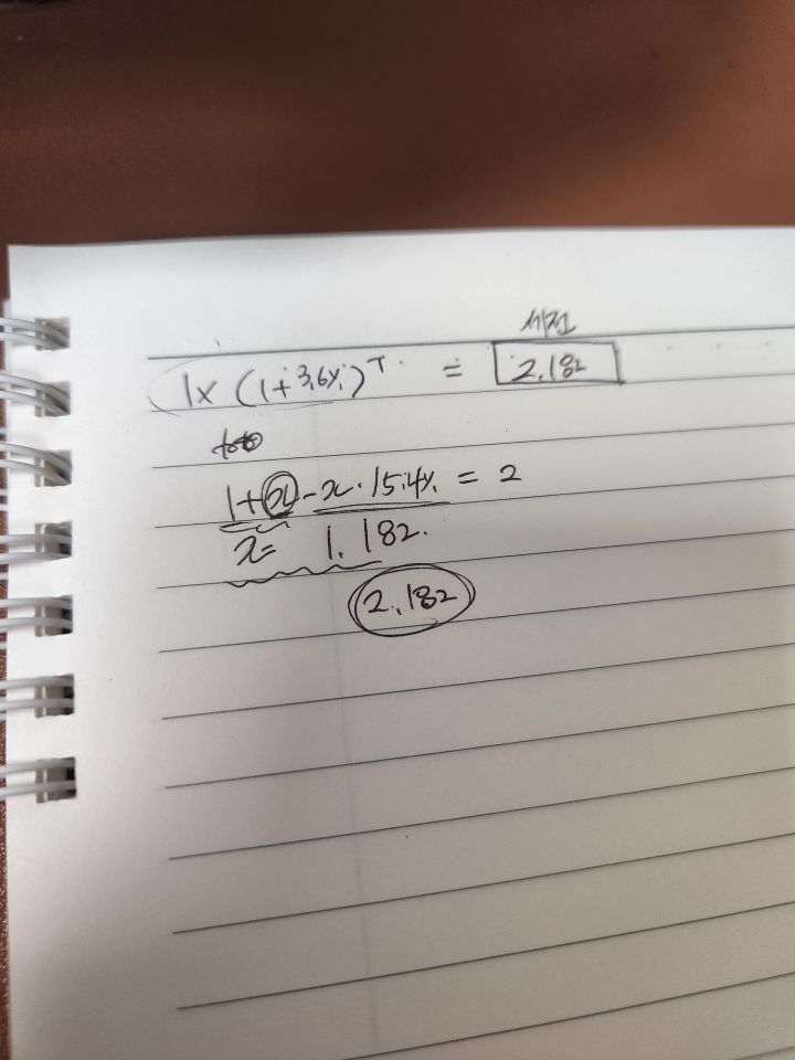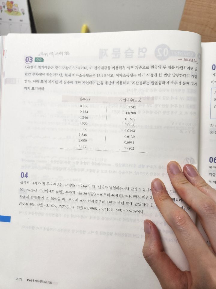 작성자CPPPA 작성시간 23.04.16 양변에 자연로그 ln을 붙여봐요. (즉 3=3 이면 ln3 = ln3). 로그 성질로 인해 T가 앞으로 내려오고요 (t x ln (1.036) = ln (2.182) ) 그러면 이제 표에 ln (1.036) 과 ln (2.182) 이 뭔 값인지 나와있으니까 t를 구할수 있겠죠