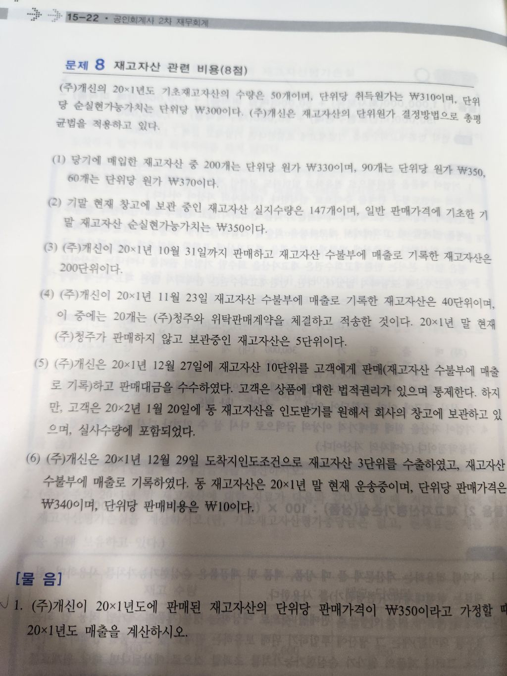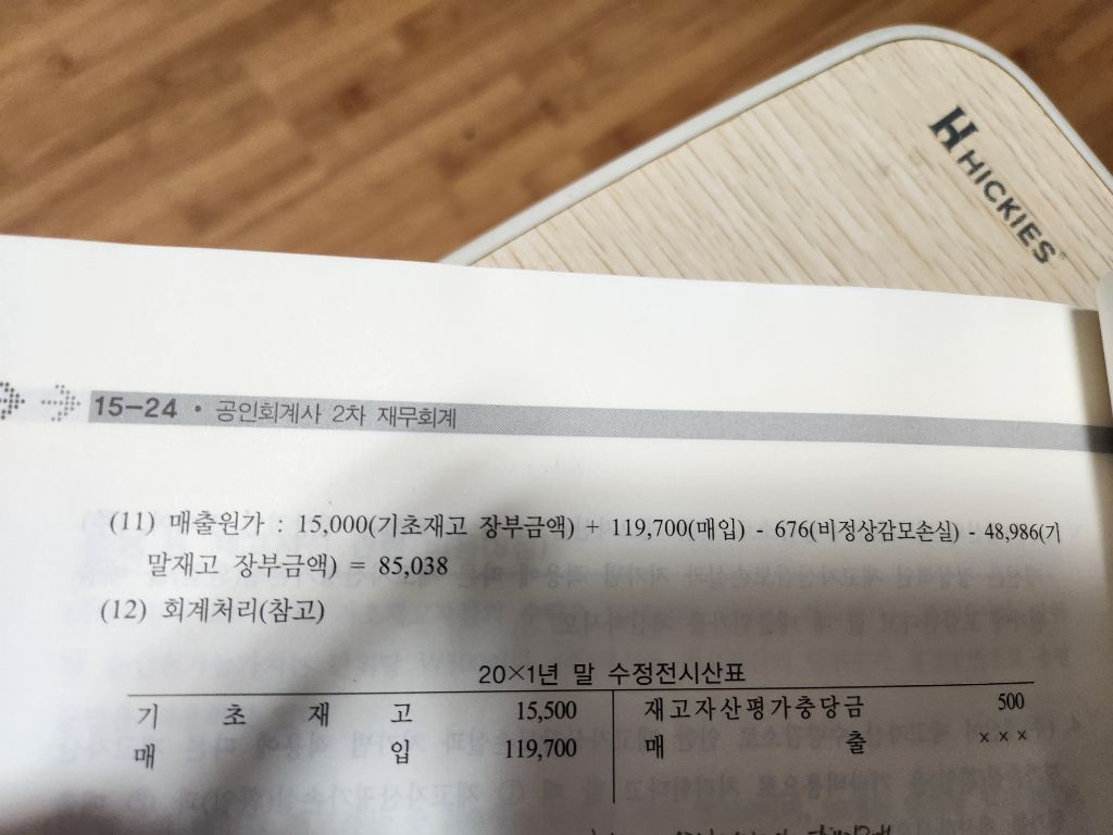 작성자bzong20 작성시간 23.10.14 물음3의 단서를 보시면 비정상감모손실 20%를 제외하고는 다 매출원가로 본다고 했기때문에 재고자산관련 총비용을 먼저 계산하고 비정상감모손실만 총비용에서 차감하는 방식으로 식이 구성되어 있고, 총비용을 계산할때는 감모손실과 기초 및 기말 평가손실을 다 반영한 장부금액으로 풀어야하기 때문입니다. 식으로 풀면,