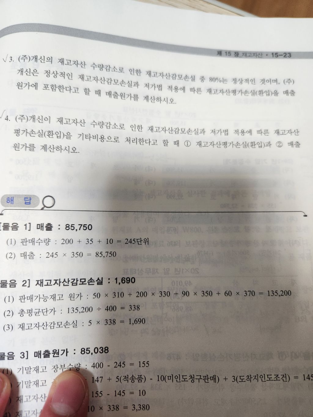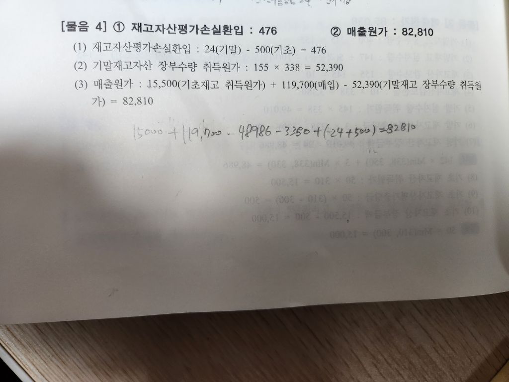 반면에 물음4의 단서는 감모손실과 평가손실을 모두 기타비용으로 처리한다고 하기때문에 감모와 기초 및 기말 평가손실을 제외한 금액인 취득원가로 풀어야 매출원가가 나와서 그렇습니다. 그리고 쓰신 식을 위의 방식인 총비용에서 감모손실과 평가손실을 빼서 매출원가를 구하는 식으로 변경하면,