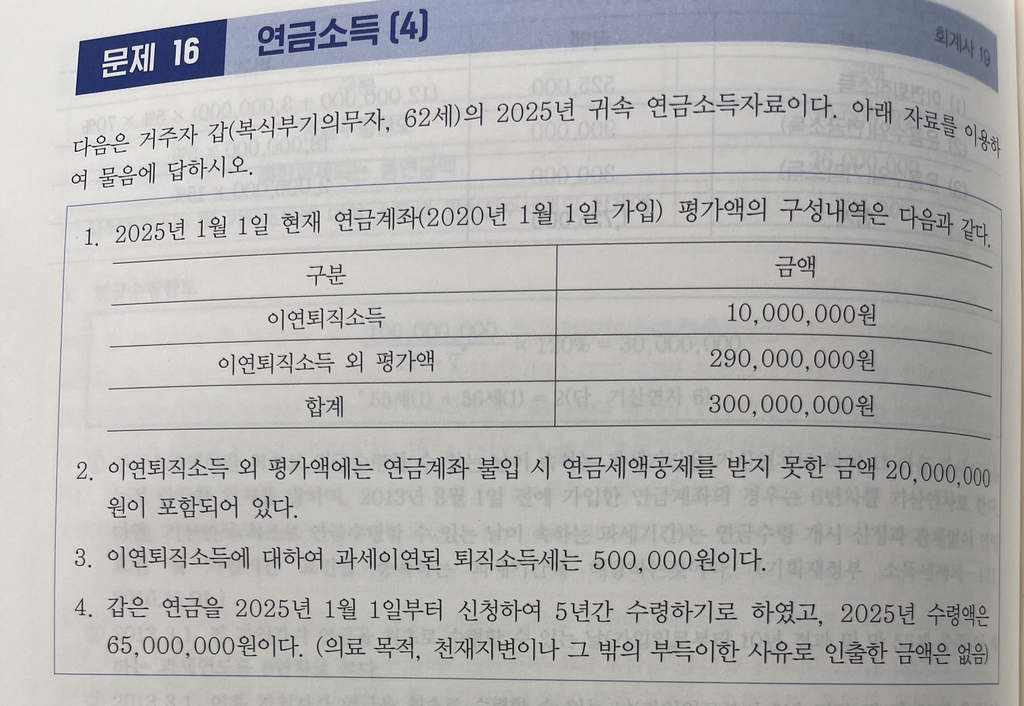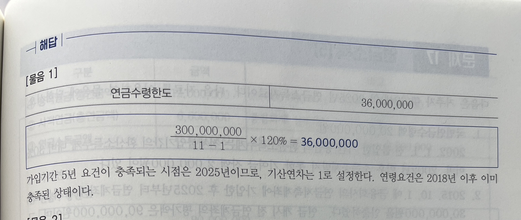 연금수령한도, 이연퇴직있을때 5년요건 보나요? 작성자끝까지한번해보자|작성시간25.03.12|조회수322 목록 댓글 2 글자크기 작게가 글자크기 크게가 강경태꺼로 작년 공부했다가올해 강의들을 시간 없다보니다른 선생님 문제집 풀고있는데… 이연퇴직 있는데도 5년 요건을 보고있어서..이게 맞나요?? 다음검색 현재 게시글 추가 기능 열기 북마크 공유하기 신고 센터로 신고 댓글 댓글 2 댓글쓰기 답글쓰기 댓글 리스트 작성자군씨파 | 작성시간 25.03.12 안봐요 답댓글 작성자끝까지한번해보자 작성자 본인 여부 작성자 | 작성시간 25.03.12 답감사해요!그렇다면위에 문제에서 한도 계산할때8년차로 계산해야하는게 맞는거지요?3억/(11-8) * 120% 루요..! 댓글 전체보기