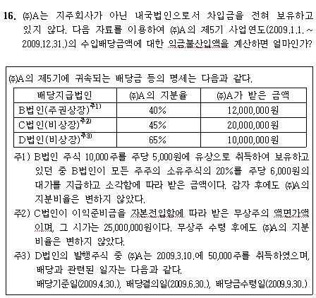 수입금액 익금불산입 기출 풀어주세요 작성자표주박|작성시간10.12.24|조회수91 목록 댓글 2 글자크기 작게가 글자크기 크게가 09년 기출인데 B 법인 6 C 법인 6 D 법인 0 합 12 아닌가요? 답은 7이던데 어케 해서 이렇게 나오죠? 다음검색 현재 게시글 추가 기능 열기 북마크 공유하기 신고 센터로 신고 댓글 댓글 2 댓글쓰기 답글쓰기 댓글 리스트 작성자GodBeWithYou | 작성시간 10.12.24 B: (12,000,000 - 10,000주*5,000*20%)*50% = 1,000,000C: 20,000,000*30% = 6,000,000D: 0 답댓글 작성자GodBeWithYou | 작성시간 10.12.24 B법인 관련해서 의제배당액을 잘못 계산하셨네요.보시면 소각으로인한 의제배당은 수령한대가 - 취득가액 입니다. 댓글 전체보기