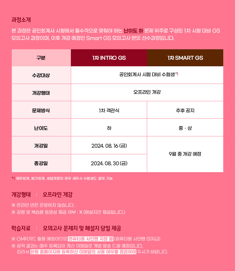 [스마트경영] 1차 INTRO GS 모의고사반_8월 16일 개강 작성자양소영|작성시간24.07.28|조회수807 목록 댓글 0 글자크기 작게가 글자크기 크게가 안녕하세요. 양소영회계사입니다. 공인회계사/세무사 1차 시험 대비 인트로 GS 모의고사반(3회 하프모의고사과정)이 아래와 같이 8월 16일에 스마트경영아카데미에서 개강됩니다.. 1차 시험대비 실전연습을 하기 좋은 오프라인 과정이므로 많은 참여부탁드립니다. 추후 9월 중에는 공인회계사/세무사 1차 시험 대비 스마트 GS 모의고사반을 인트로 GS보다는 좀 더 긴 기간으로 진행할 예정입니다. 많은 관심부탁드립니다. 다음검색 현재 게시글 추가 기능 열기 북마크 공유하기 신고 센터로 신고 댓글 댓글 0 댓글쓰기 답글쓰기 댓글 리스트