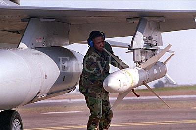 -.전투기에 AIM-9 side-winder(사이더와인더 미사일)을 장착하는 모습