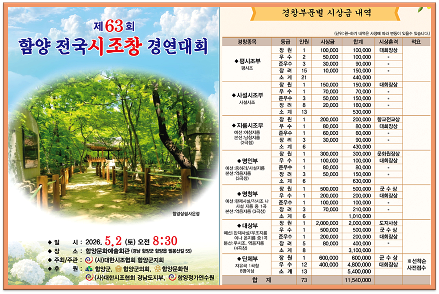 함양지회, 제63회 전국시조창 경연대회 안내(5.2.토) 작성자정세주|작성시간26.04.04|조회수39 목록 댓글 3 글자크기 작게가 글자크기 크게가 다음검색 현재 게시글 추가 기능 열기 북마크 공유하기 신고 센터로 신고 댓글 댓글 3 댓글쓰기 답글쓰기 댓글 리스트 작성자정세주 작성자 본인 여부 작성자 | 작성시간 26.04.04 new 성황 이루는경연대회가 되시기를응원합니다. 답댓글 작성자덕암 최권준 | 작성시간 26.04.04 new 응원해 주셔서 감사합니다.함양지회장 최권준 작성자풍물호 | 작성시간 2시간 22분 전 new 풍성한 대회가 이루지길 바랍니다. 댓글 전체보기
