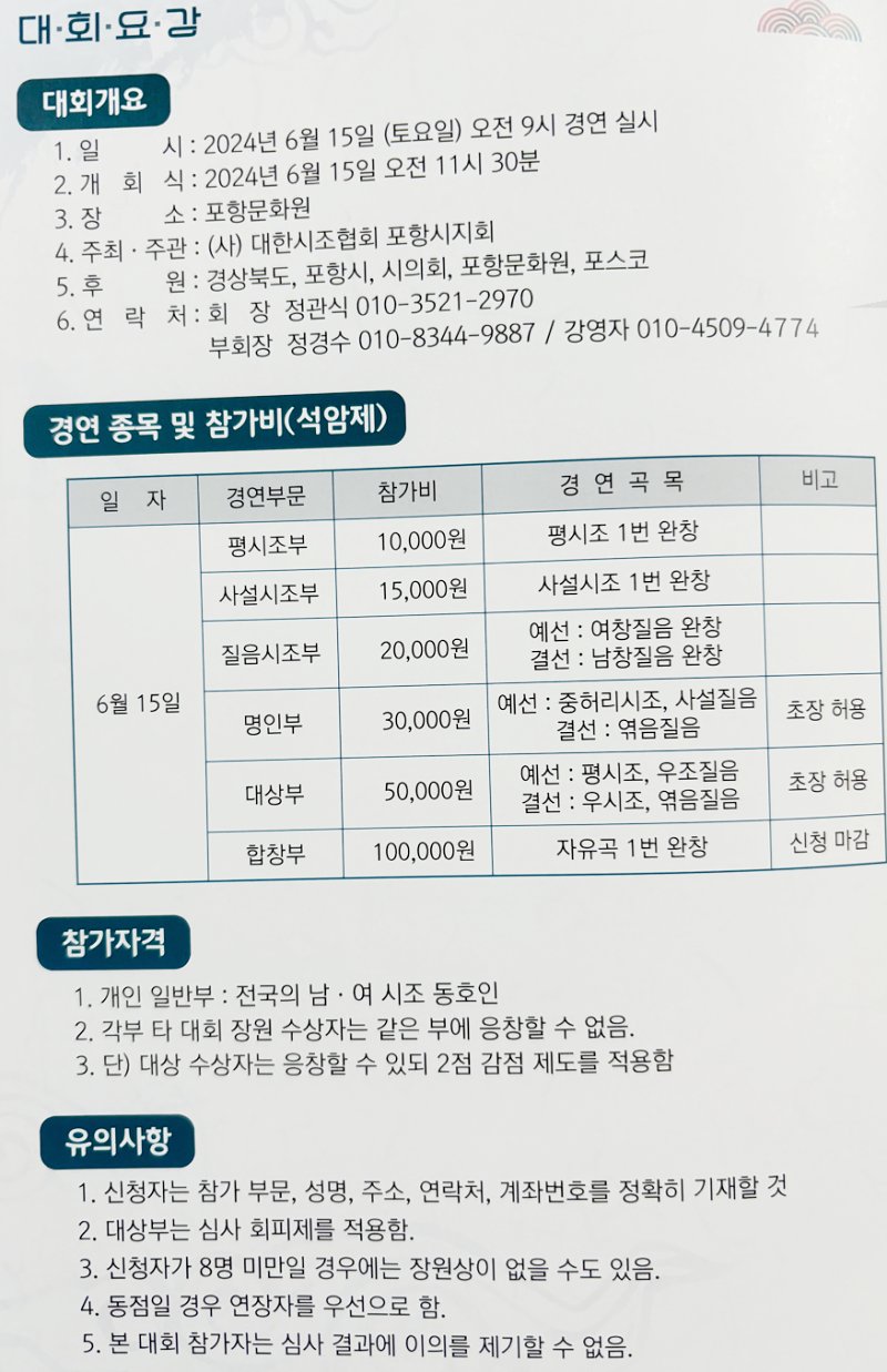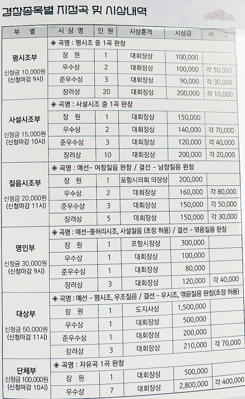 포항지회, 제31회 전국시조창경연대회 알림 (6.15.토) 작성자김영아|작성시간24.06.07|조회수158 목록 댓글 0 글자크기 작게가 글자크기 크게가 다음검색 현재 게시글 추가 기능 열기 북마크 공유하기 신고 센터로 신고 댓글 댓글 0 댓글쓰기 답글쓰기 댓글 리스트
