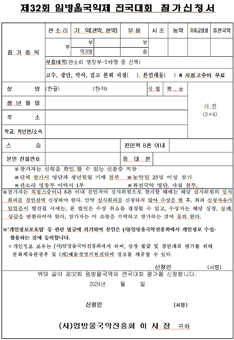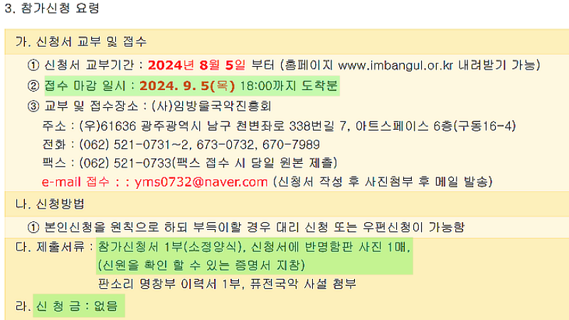 임방울 시조창 경연대회 참가신청 접수시작(8.5~9.5) 작성자정세주|작성시간24.08.06|조회수258 목록 댓글 0 글자크기 작게가 글자크기 크게가 다음검색 현재 게시글 추가 기능 열기 북마크 공유하기 신고 센터로 신고 댓글 댓글 0 댓글쓰기 답글쓰기 댓글 리스트