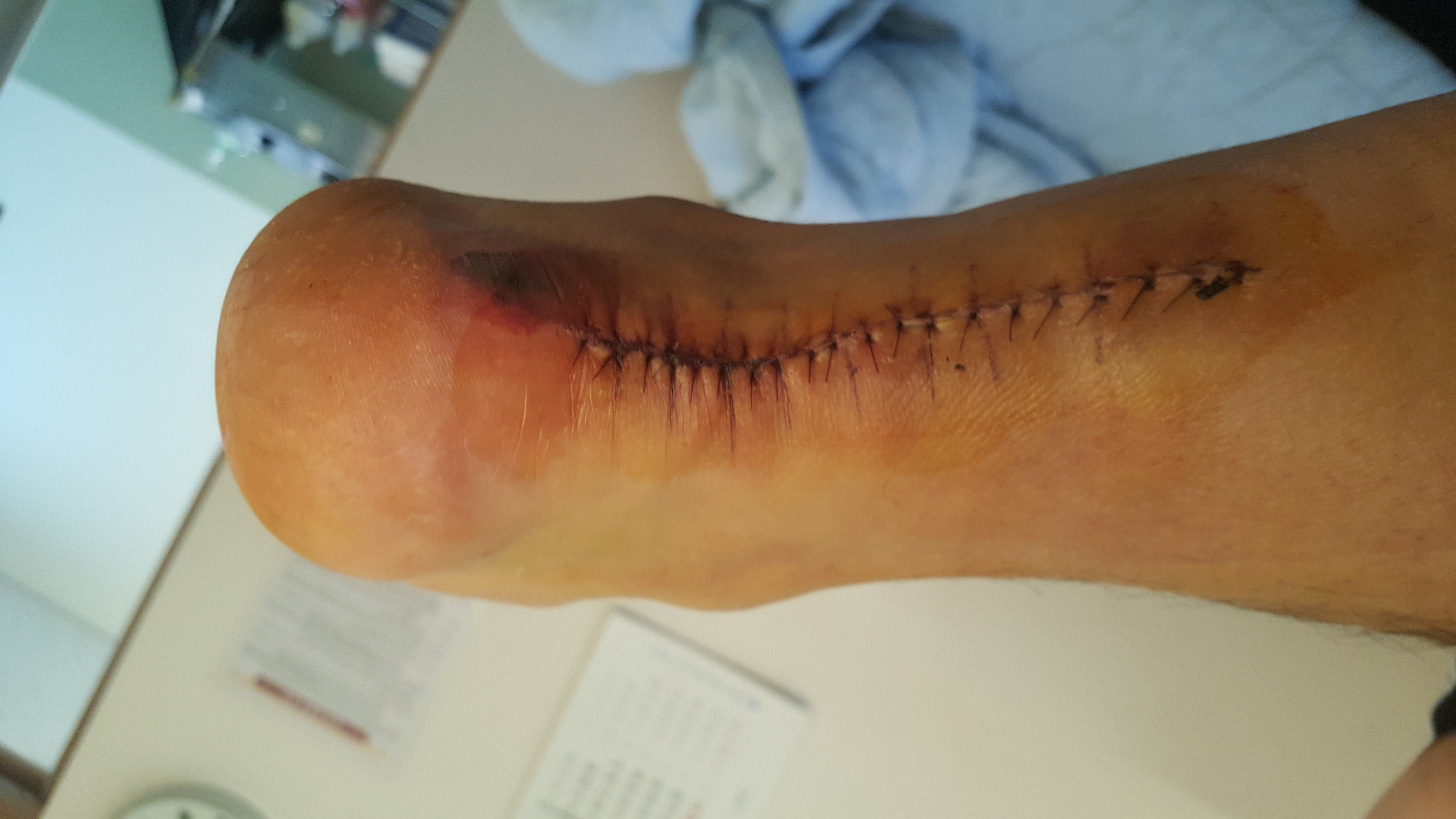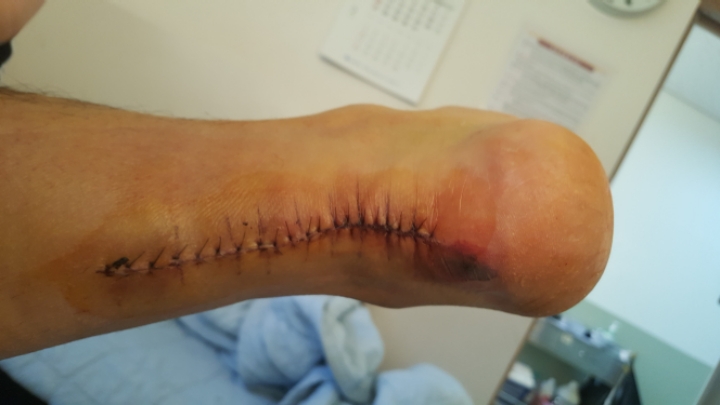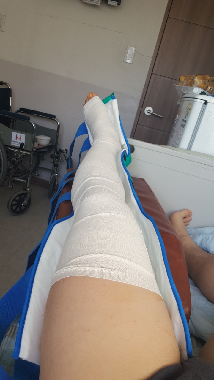 사진에 보다시피 수술부위 바로 옆에 동그랗게 멍이.들었습니다. 반깁스시 최초의 형태에서 이틀에 한번 소독할때 조금씩 안맞아서 발꿈치 옆에 자꾸 데여서 그부분을 눌려서 멍이 든것으로 판단됩니다. 의사도 보더니 별말안하고 반깁스에 패드좀 덧붙여있습니다. 그래서 침대에 누워있을때 반깁스를 풀고 누워있습니다 ㅎㅎ 괜찮겠지요????